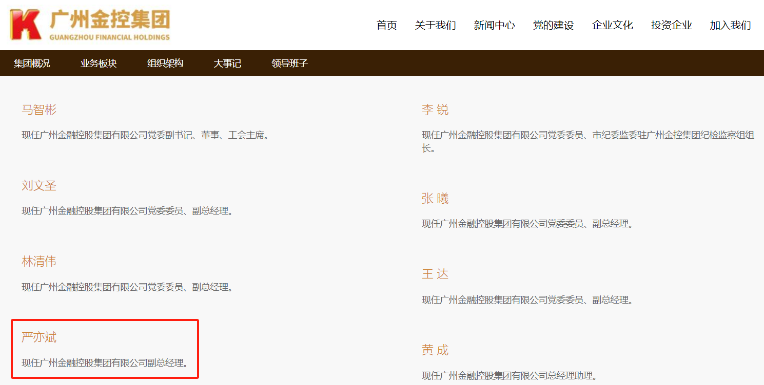 《财中社》查询广州金控集团官网发现,严亦斌已位列集团10位班子成员名单中。广州金控集团相关人士也向媒体证实,严亦斌已到任,主要分管招商工作。